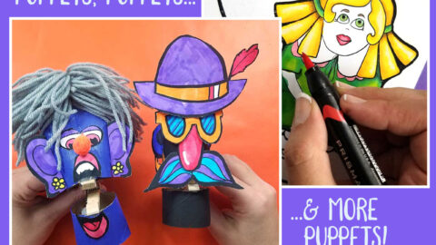 1. Color your puppets. Choose your favorite “add-ons” – teeth, horns, ears, etc. and color those to coordinate.