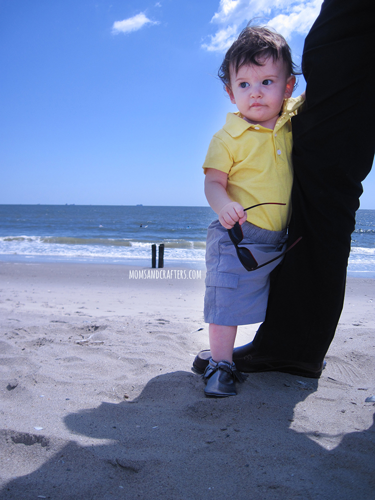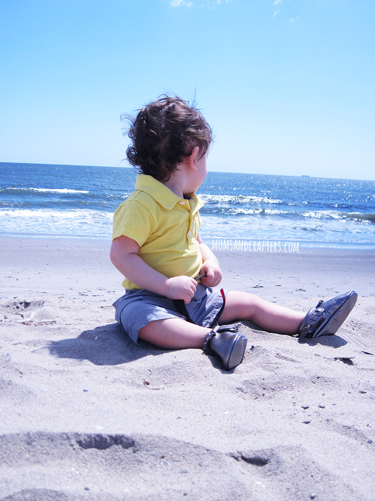 The “steel” color that I requestedย is a classy gunmetal shade – one of my favorites! I was surprised at how soft the leather feels. I had no problem using the size charts provided to order the correct size. I actually went ahead and ordered one size up and he can wear them just fine. My baby has huge feet, but he did not look awkward in them at all, as I had feared when I first saw how big they are. As a matter of fact, he looked adorable! We went to the beach that Sunday, and couldn’t resist taking loads and loads of photos. I had trouble choosing a few to share in this review – this is the best that I can do!